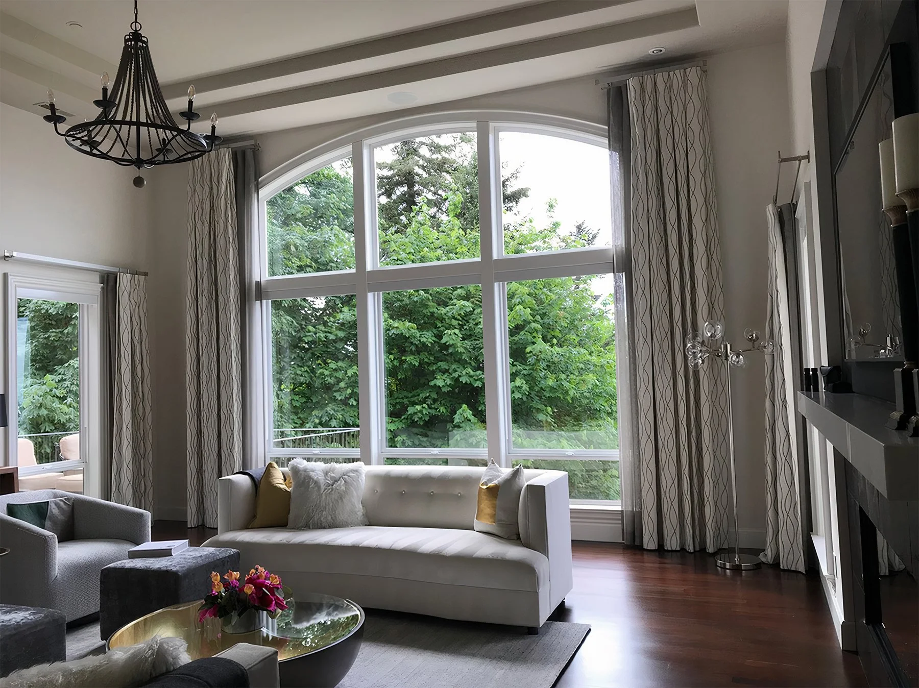 Fortunately, Joanna had already installed motorized sunscreen shades. This was good news for the design! With that practical problem solved, we could focus solely on aesthetics. We decided to frame Joanna’s windows with drapery panels that would add to the inspiration of the view rather than detract from it. The acoustic concern would take care of itself once the custom draperies were hung.