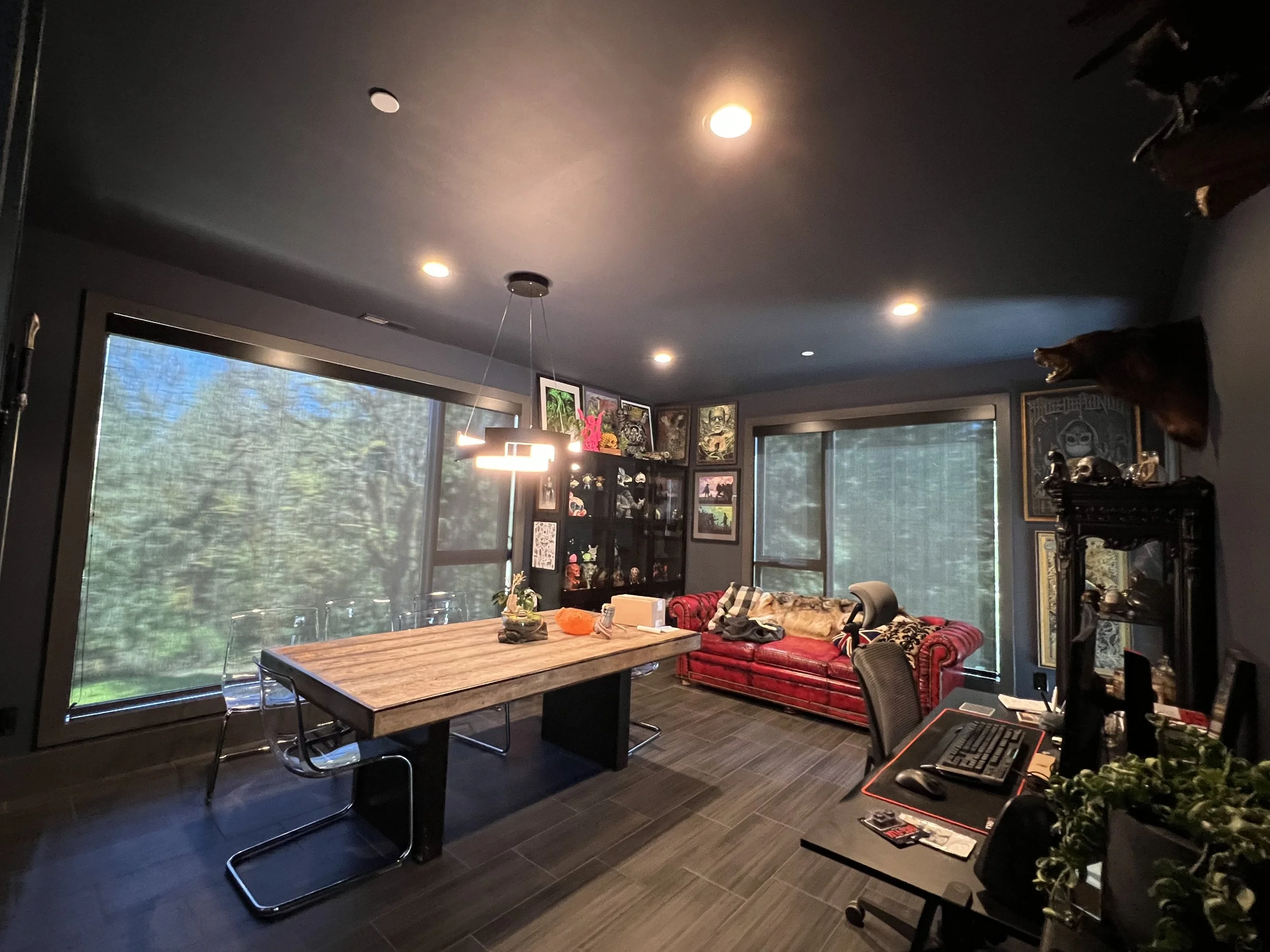These would be centerpieces of the office interior design, but they would also leave us without room for the gliding panels. Instead, we determined that inside-mount roller shades would work better and give Nathan the view he desired while offering a neutral palette to unify the rest of the eclectic elements in the room.