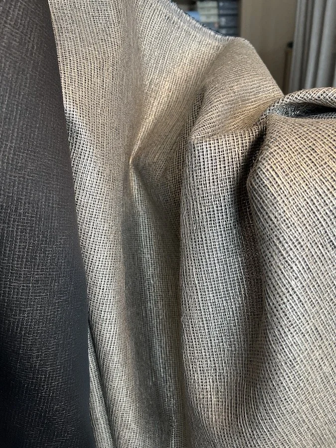 We were looking through the fabric books I had brought with me, and our eyes landed on a metallic-textured fabric from Kravet. It had just the right amount of sheen and an Asian feel that complemented the artwork across the room. The only challenge was that it was an unstable open-weave, and it would need to be backed by a fabric that would support it.