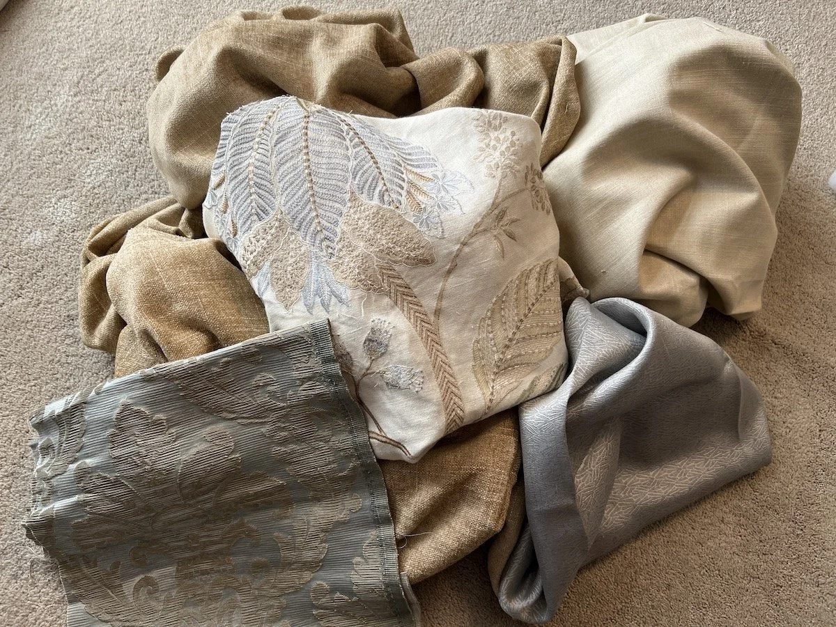 Our focus shifted to the original subjects of the design project: the window cornice boards and the custom bedding. I began laying out the fabric groups I had selected, inviting Nancy to join me in the decision-making process.